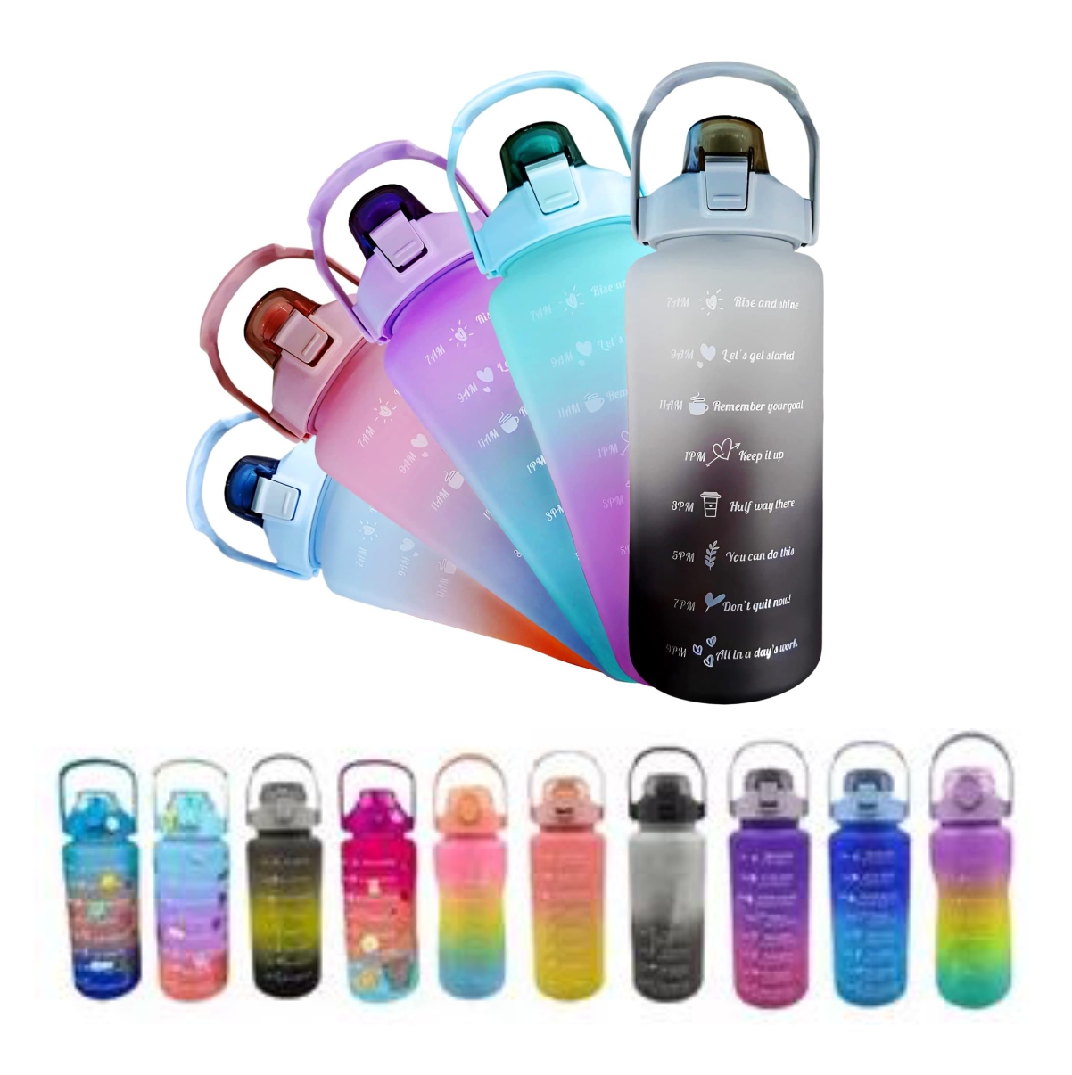 Te presentamos la Botella Deportiva Motivacional de 2 Litros, el accesorio esencial que DEBES llevar a tu gimnasio, oficina o aventura. Diseñada con un marcador de tiempo y citas inspiradoras, esta botella es perfecta para ayudarte a mantenerte motivado y medir tu ingesta diaria de agua de forma fácil y evidente.