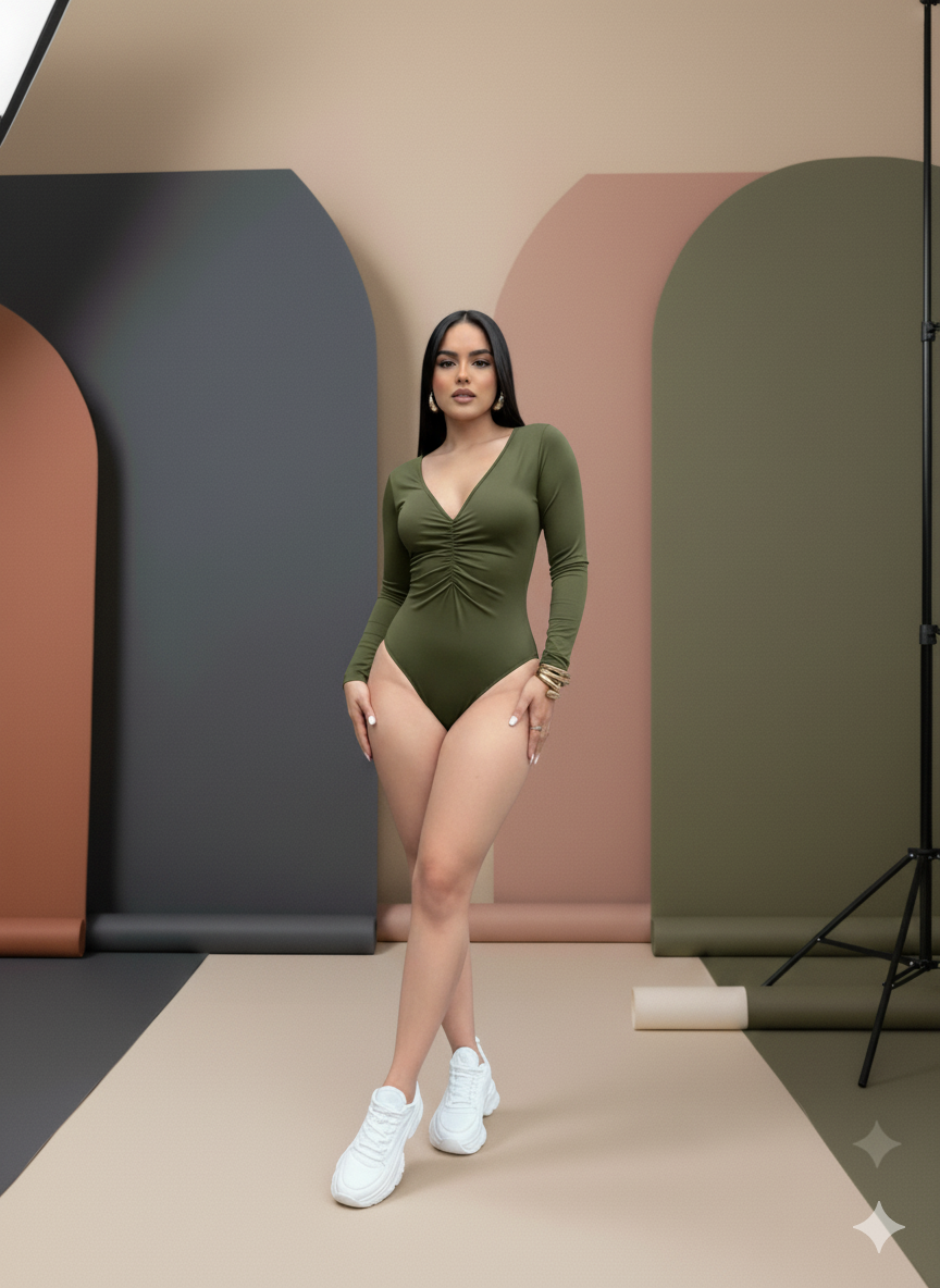 💚✨ ¡Moldea y Estiliza! Body Supplex Manga Larga con Fruncido – Tu Básico de Lujo ✨💚