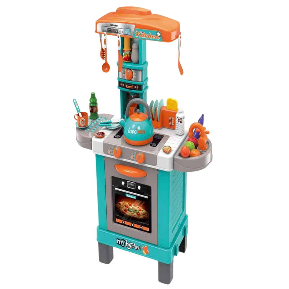 ¡Dale color y diversión al juego de roles! Esta Cocina Infantil con diseño moderno en turquesa, naranja y gris es el centro de juego ideal para que los pequeños despierten su imaginación y aprendan mientras simulan ser chefs. Recrea una cocina real con la seguridad y el tamaño perfectos para ellos.