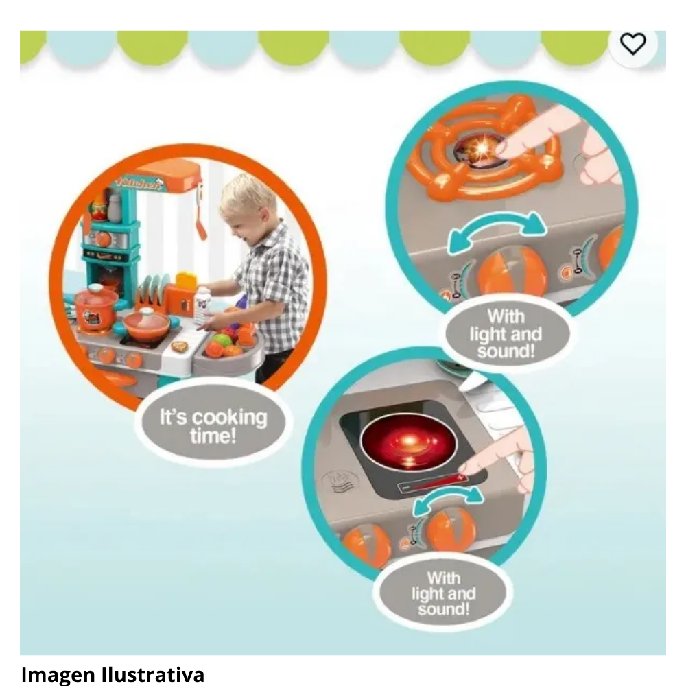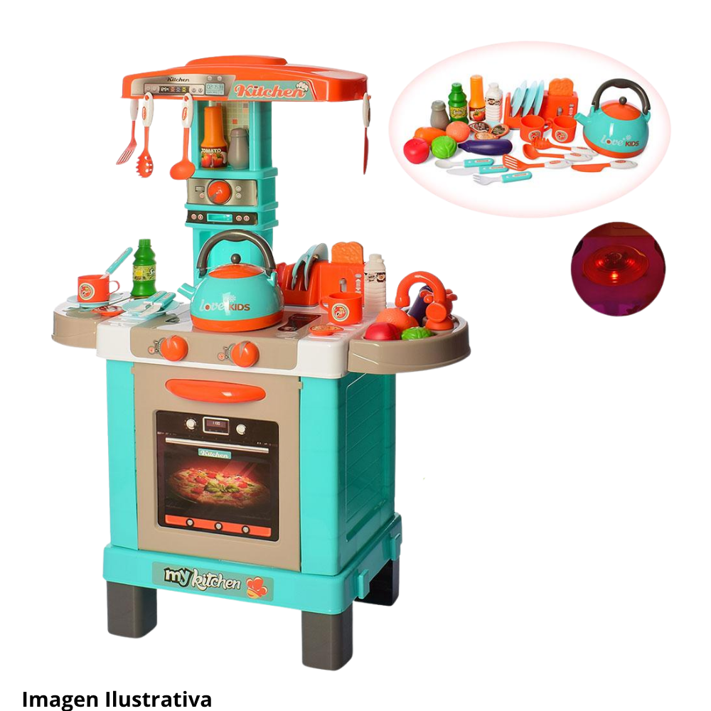 Accesorios Esenciales: Incluye un completo set de ollas, sartenes, tazas, platos, ¡e incluso una tetera!, además de alimentos de plástico para empezar a "cocinar" de inmediato.
