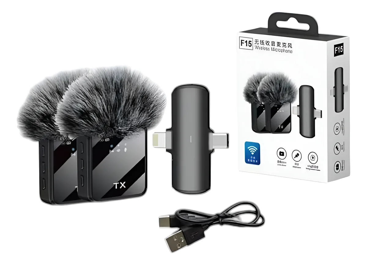 Te presentamos el Set de 2 Micrófonos Inalámbricos de Solapa Profesional F15-2, la herramienta esencial para creadores de contenido, vloggers y entrevistadores. Graba con calidad profesional y audio nítido y estable sin los cables molestos que limitan tu movimiento.